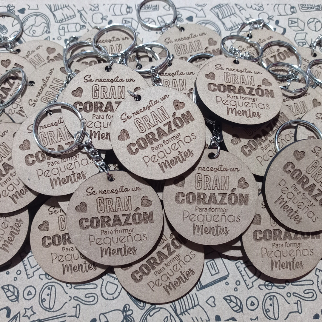 Pack llaveros de madera cortados y grabados 5 cms, personalizados con logo y texto, cadena y argolla incluida.